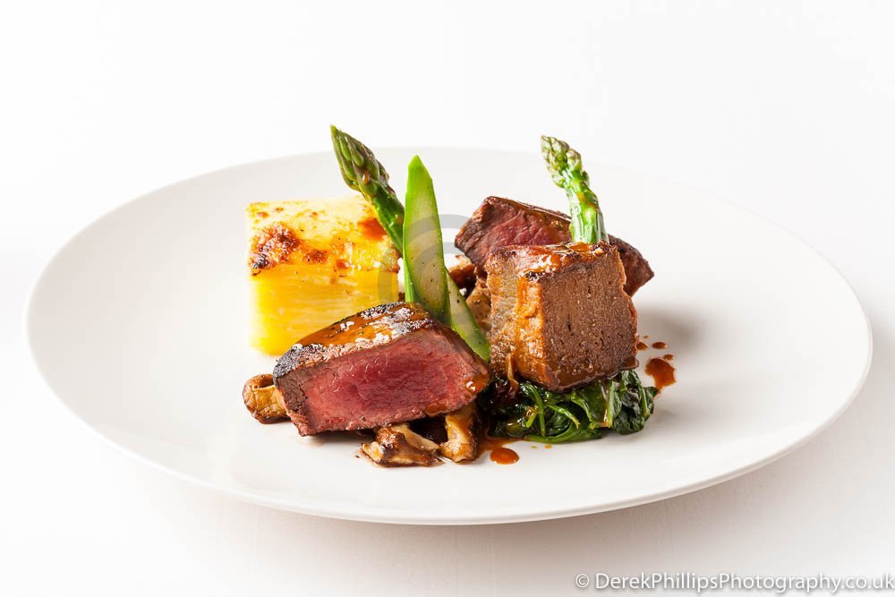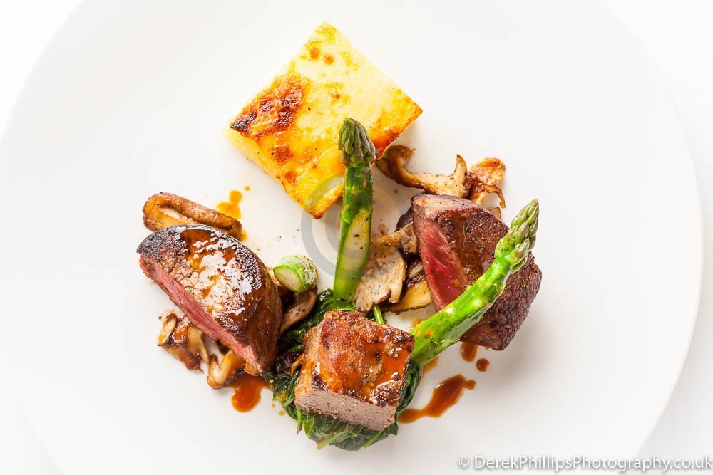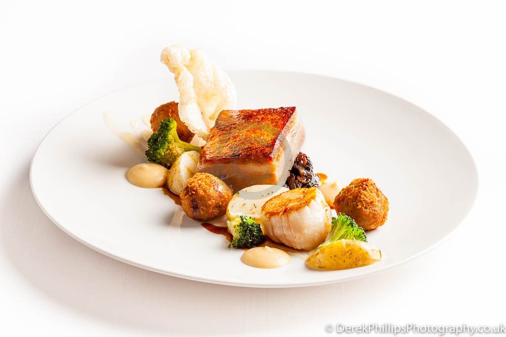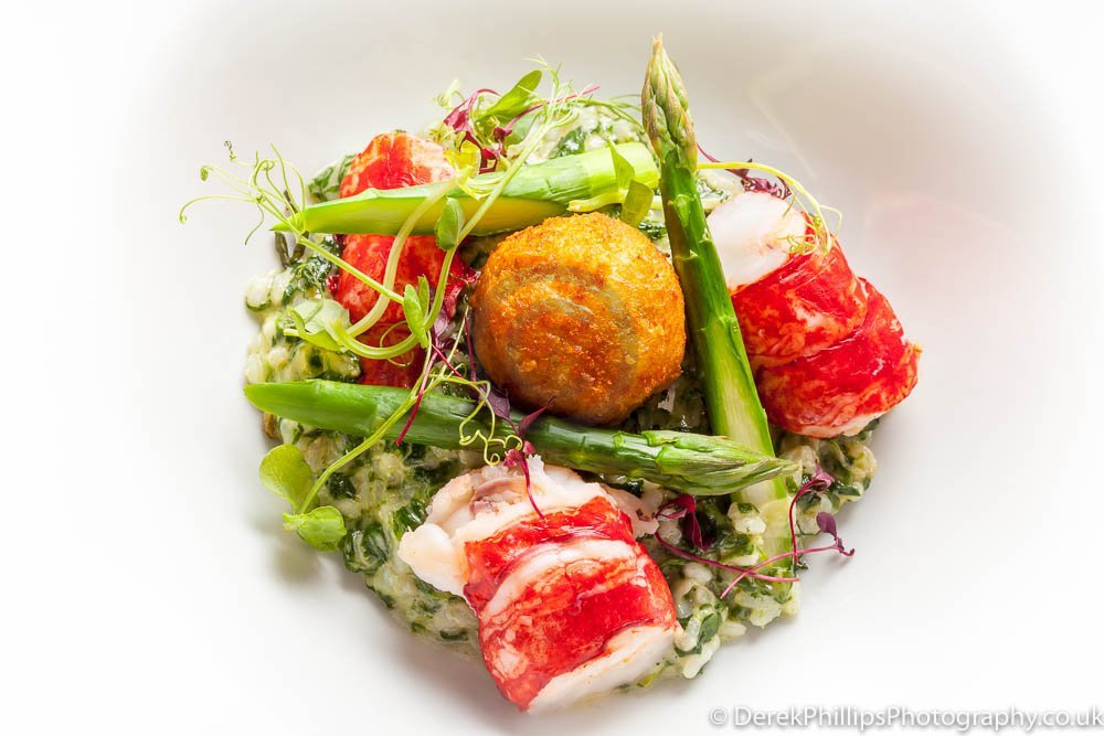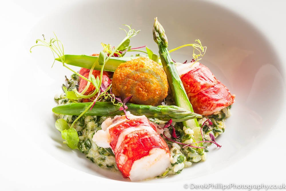 The hotel needed high quality images for publication in the Great British Cookbook so we set up a small studio next to the kitchens with table, lights, reflectors and camera. The chefs worked on the dishes and brought them to the studio freshly cooked. The dishes were initially prepared and the lighting adjusted before a second, or sometimes third, dish was created using what had been learned to get the best presentation and lighting.