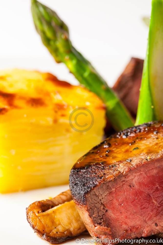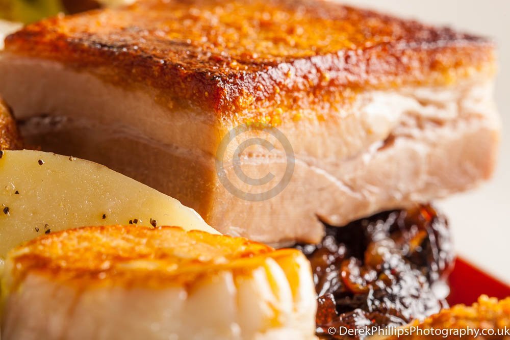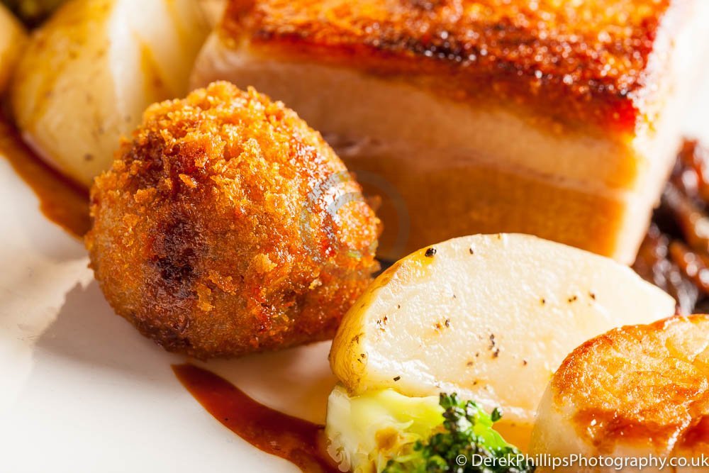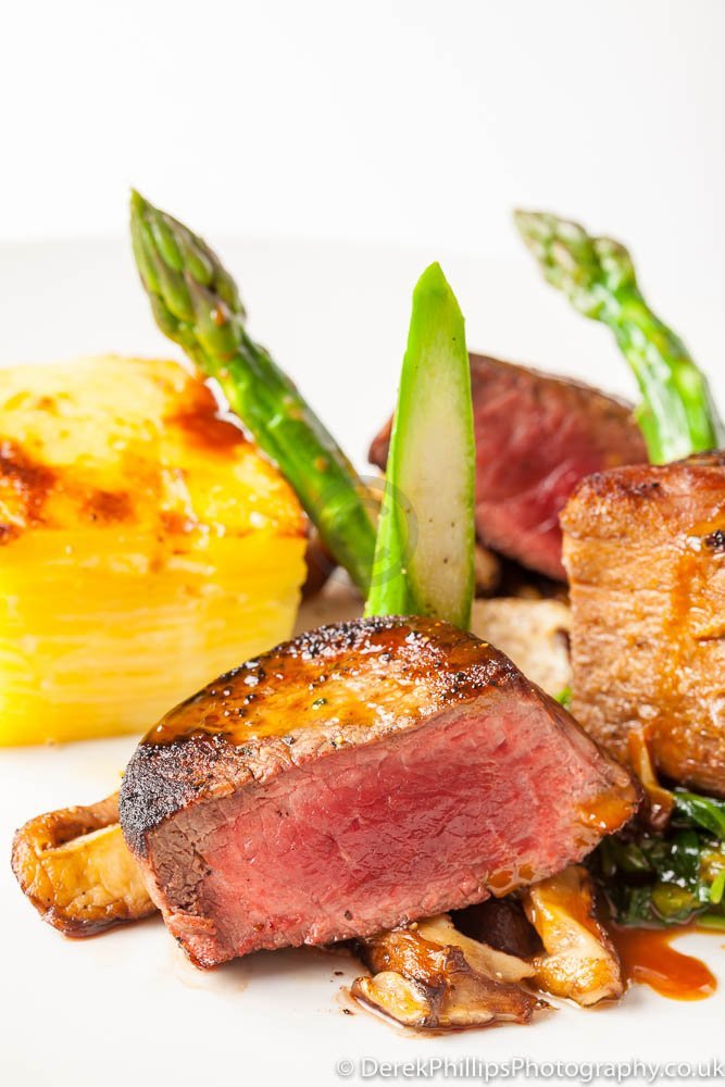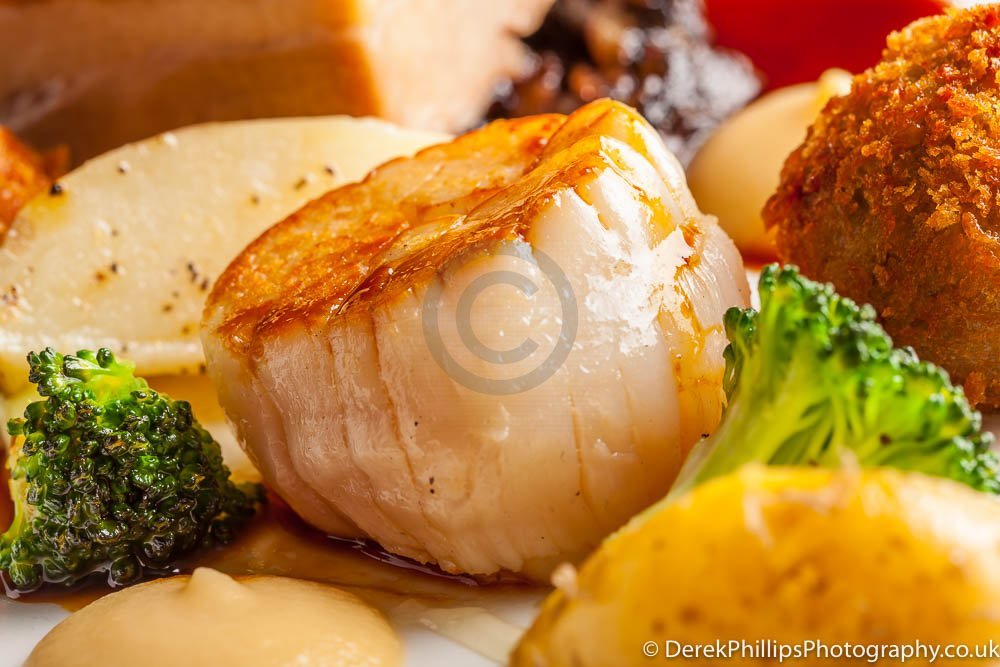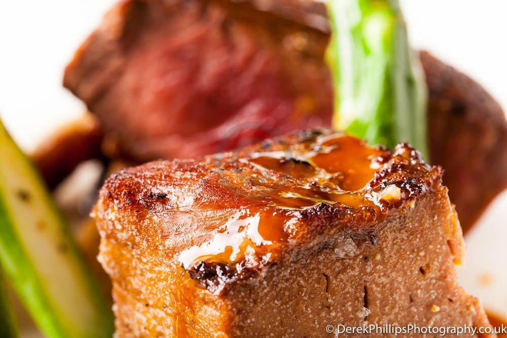 The hotel needed high quality images for publication in the Great British Cookbook so we set up a small studio next to the kitchens with table, lights, reflectors and camera. The chefs worked on the dishes and brought them to the studio freshly cooked. The dishes were initially prepared and the lighting adjusted before a second, or sometimes third, dish was created using what had been learned to get the best presentation and lighting.