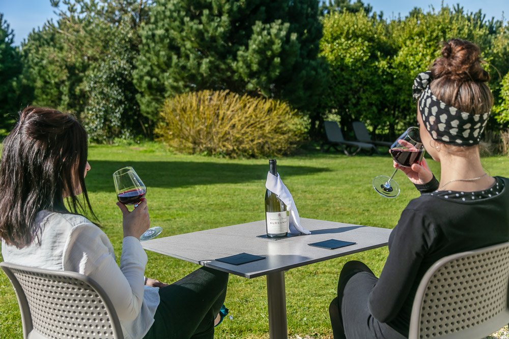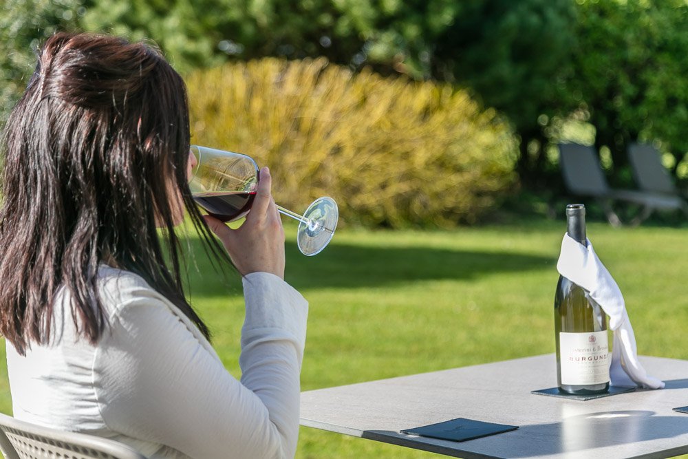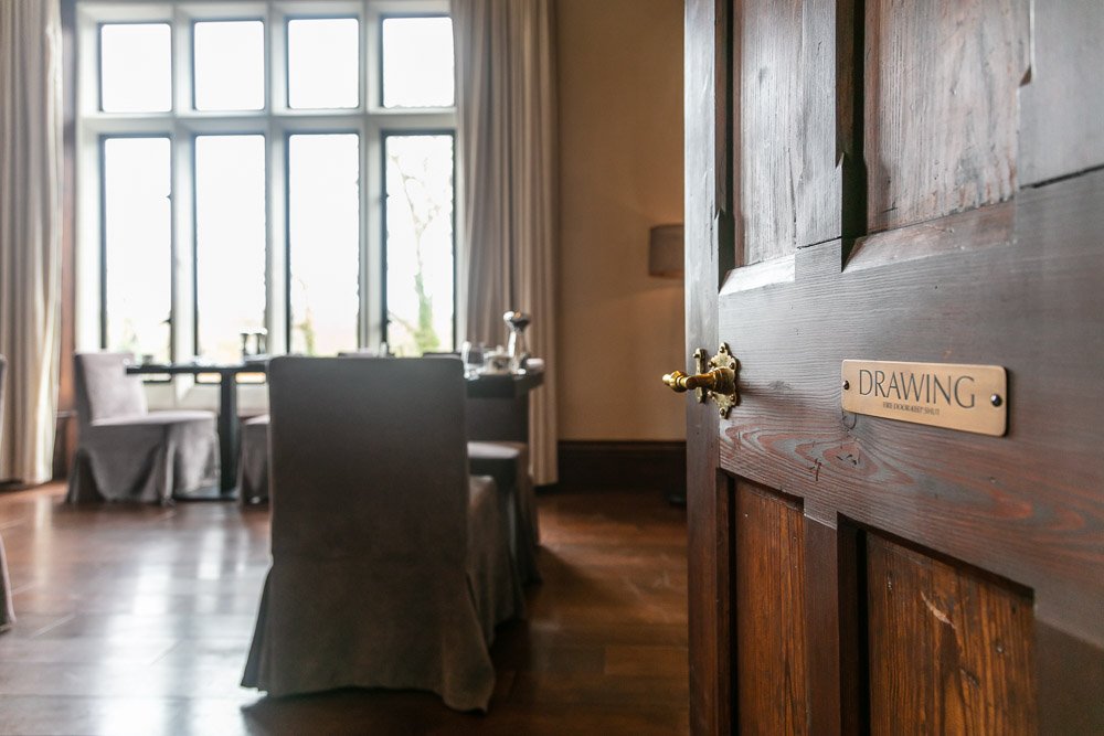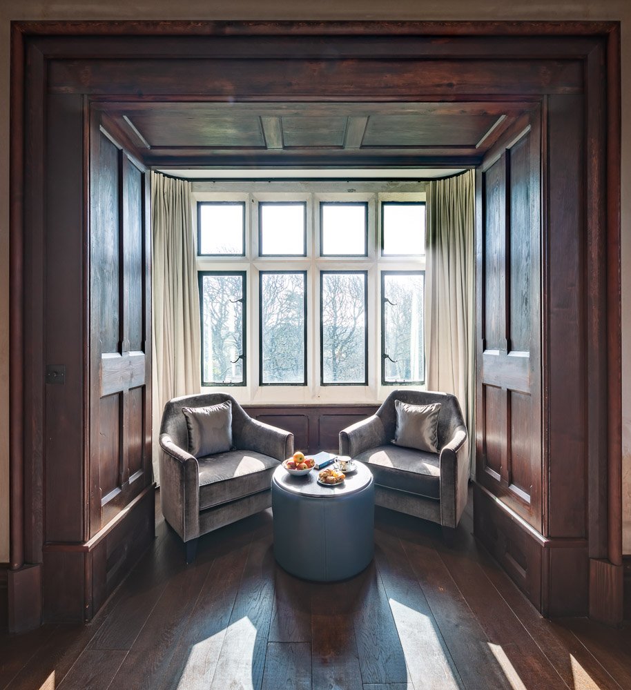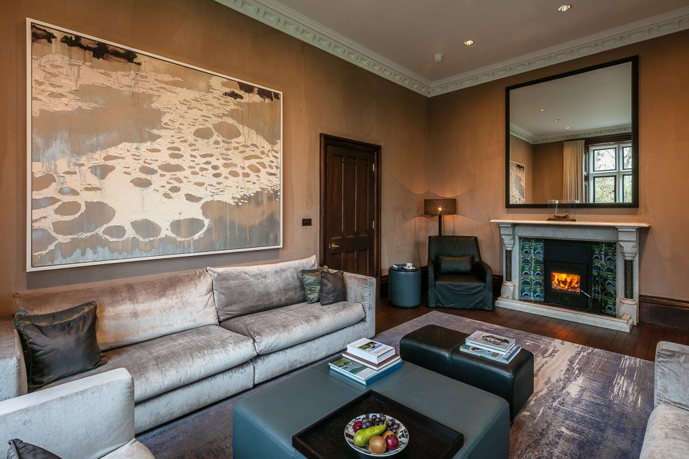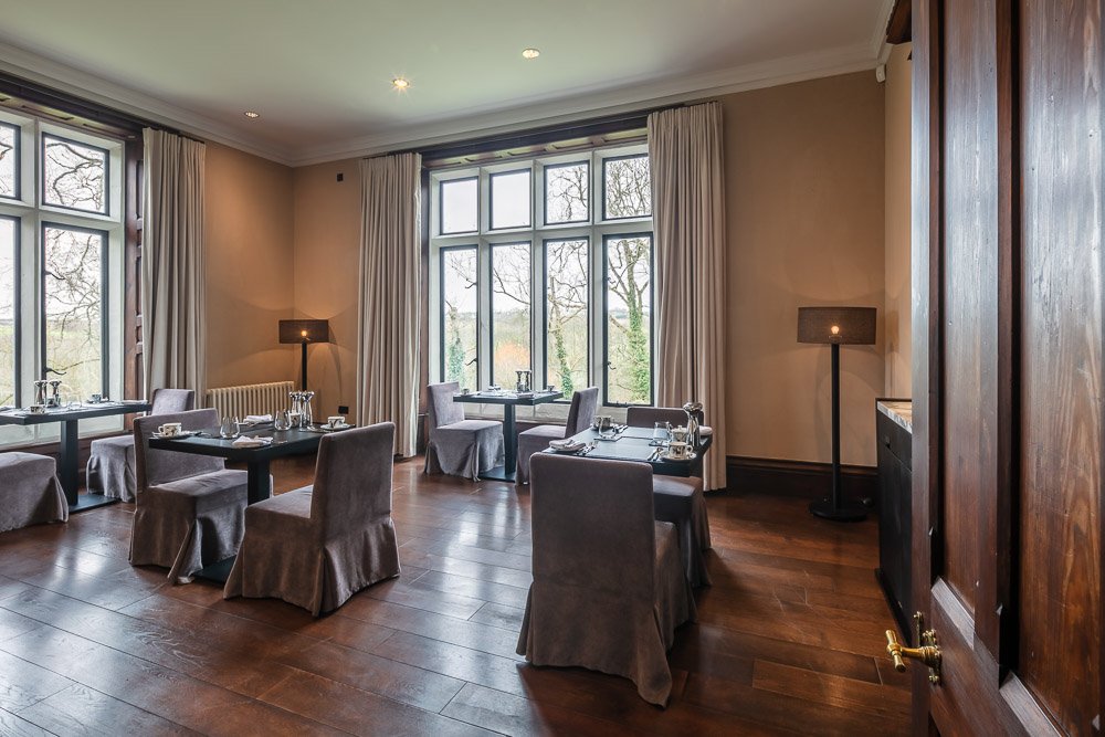 The attention to detail is evident in the immaculately set dining tables, the plush upholstery of the chairs, and the carefully selected art piece on the wall. The rich wooden floor contrasts beautifully with the soft tones of the walls, enhancing the overall luxurious feel. The intricate blue tilework within the fireplace serves as a focal point, drawing attention and adding a touch of colour to the muted palette.